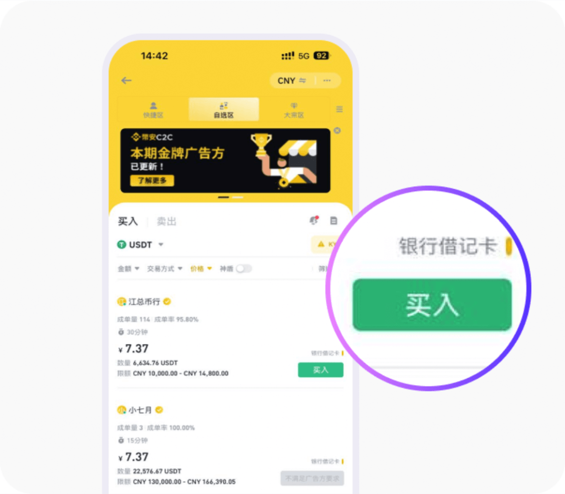 您也可以选择在C2C交易中选择商家购买,具体步骤 - 打开OKX App首页,点击【买币】- 【C2C 买币】。在购买页面,点击【USDT】可以搜索数字资产,点击【筛选】可以选择委托单类型和支付方式。设置完成后,选出符合条件的商家,点击【购买】。