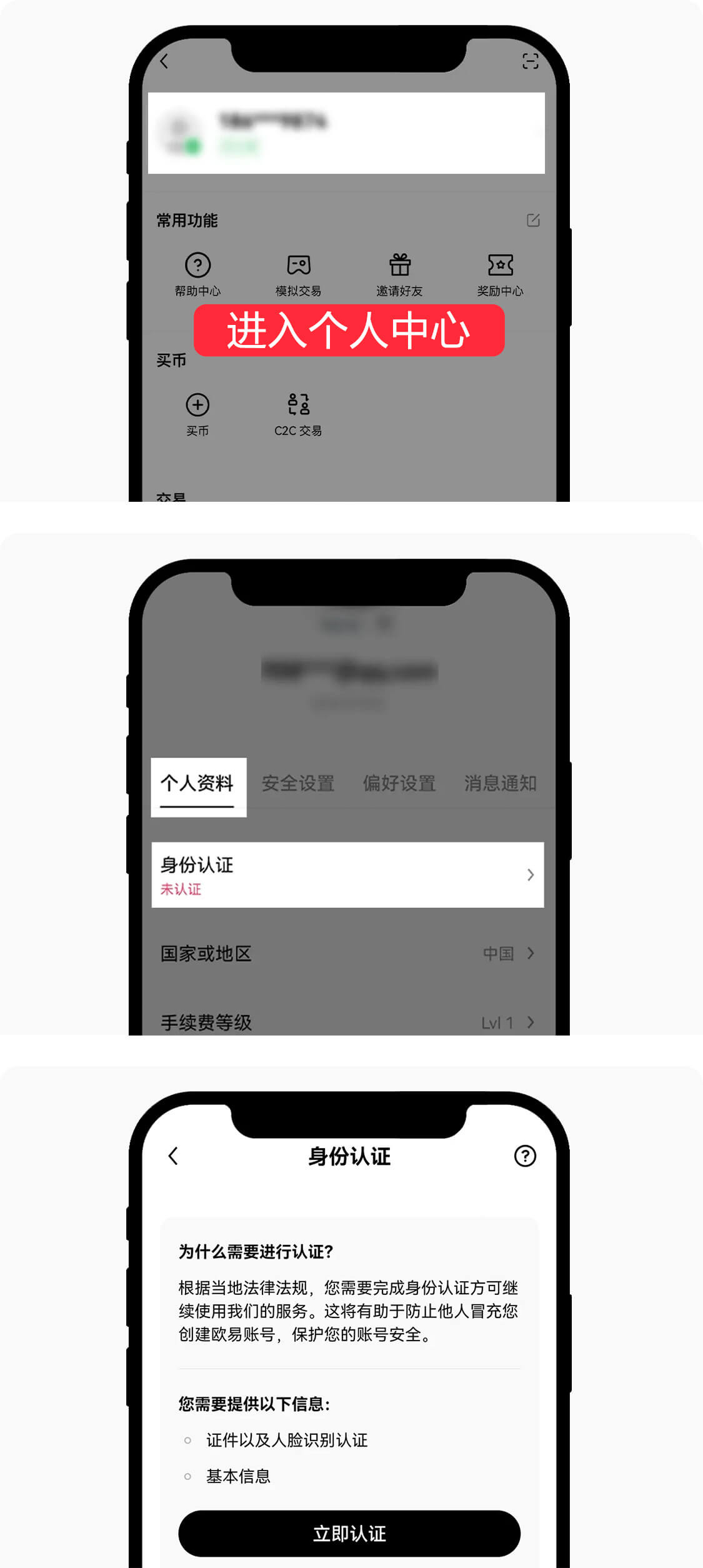 注册完成后,打开欧易 App,点击首页左上角用户中心图标—点击上方昵称/账号—【身份认证】,点击【立即认证】,进入身份认证页面。您需要上传证件照,如身份证的正反面,并通过人脸识别,根据页面提示完成证件上传和实人认证。